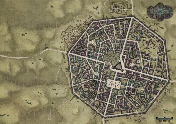 Auf dieser doppelseitig bedruckten Karte im A3-Format befindet sich auf der Vorderseite die Karte der Stadt Esmoda, auf der Rückseite die Karte der schwimmenden Stadt Askalas Traum aus dem Regionalband Fahrende Völker.