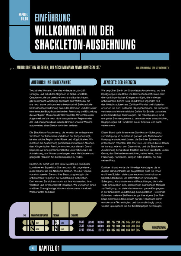 Der Shackleton-Ausdehnung-Kampagnenband für das Star Trek Adventures-Rollenspiel führt eine vollkommen neue Region des Beta-Quadranten ein – die Shackleton-Ausdehnung. Zahllose Wunder und Rätsel erwarten Sie dort, darunter seltsame Raumphänomene, die Schiffssensoren verwirren und Raumschiffe bedrohen, uralte Technologien fremdartiger Spezies, die mächtig genug sind, um ganze Sternensysteme auszulöschen, gefährliche und unbekannte Lebensformen, die es zu entdecken gilt, und noch vieles mehr …