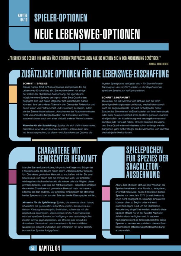 - Alle diese Inhalte sind so ausgelegt, dass sie sowohl mit einer Gruppe aus Sternenflotten-Offizieren als auch mit klingonischen Kriegern gespielt werden können.