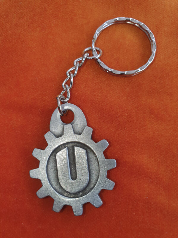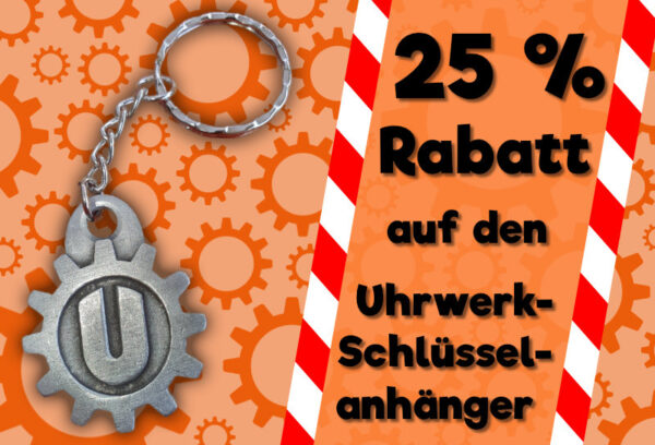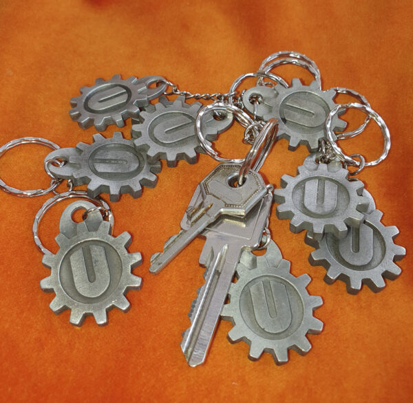 Schlüsselanhänger mit dem Uhrwerk-Logo aus Metall.